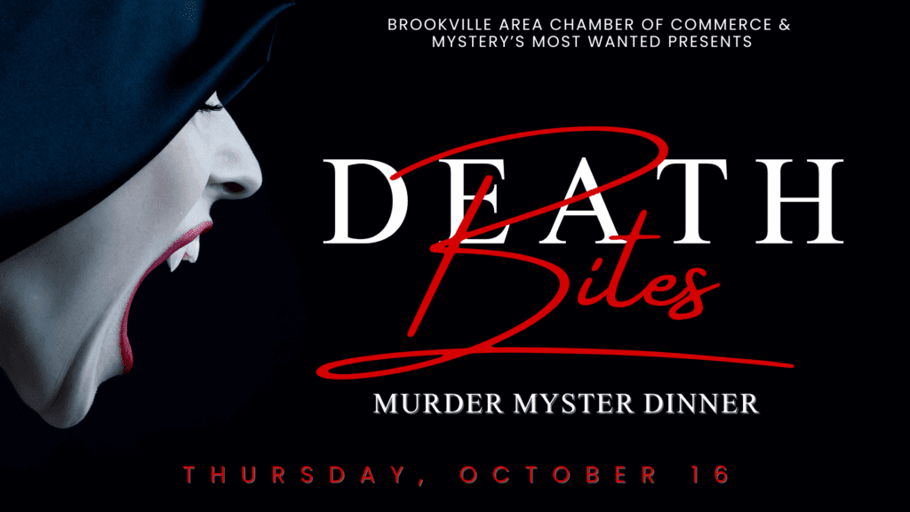 Sharpen your stakes, polish your fangs, and prepare your sharpest detective instincts! The Brookville Area Chamber of Commerce invites you to a thrilling night of sinister suspense and deadly comedy at Murder Mystery Dinner: Death Bites on Thursday, October 16, 2025, at the Brookville YMCA.