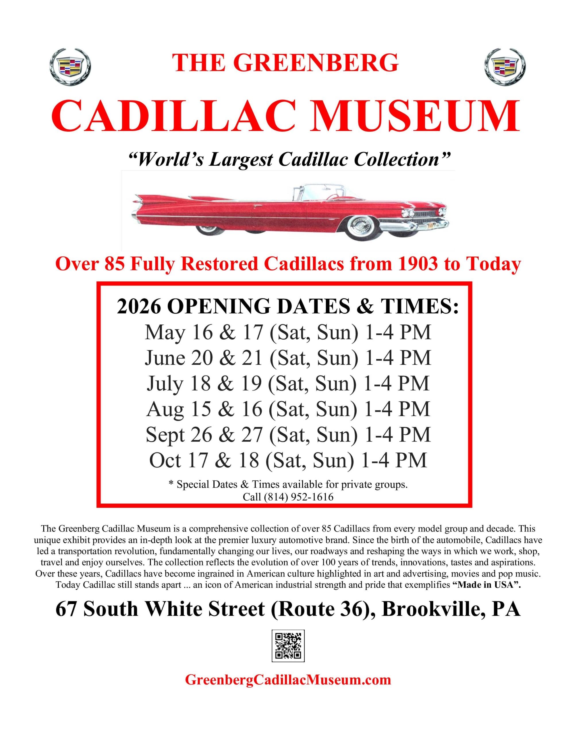 The Greenberg Cadillac Museum isn’t just a collection—it’s a full-throttle walk through America’s love affair with the automobile. Home to America’s Largest Cadillac Collection, this place is PACKED with over 85 jaw-dropping classics that defined cool for generations.