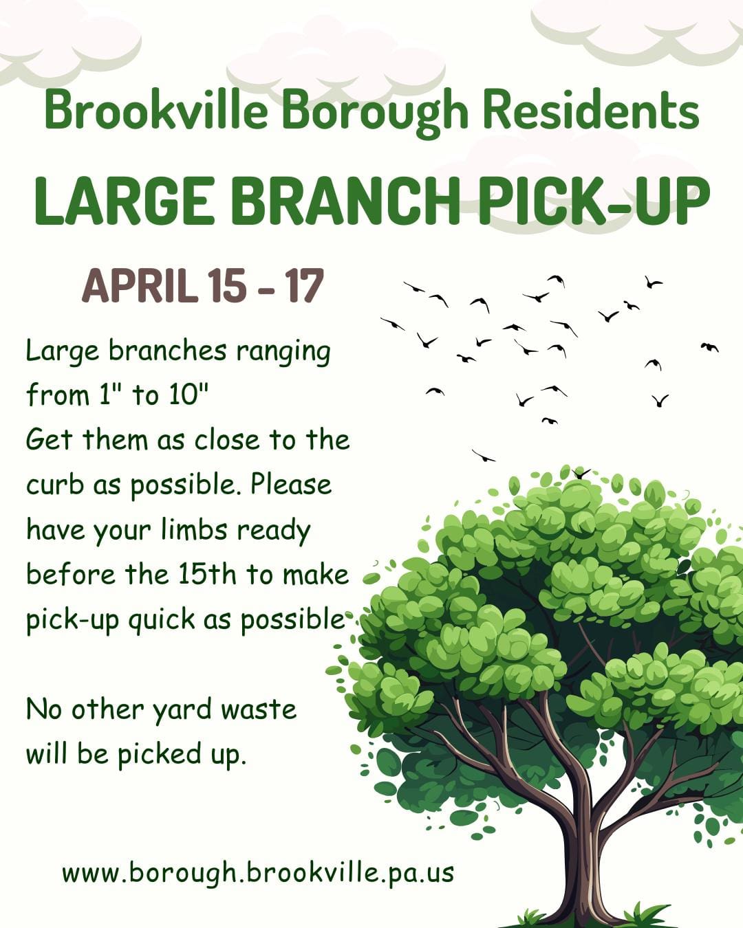 Brookville Borough will be picking up large branches from 1inch to 10 inch. Please get them as close to the curb as possible. HaveĀ your limbs ready before the 15th to make pick – up as quick as possible.