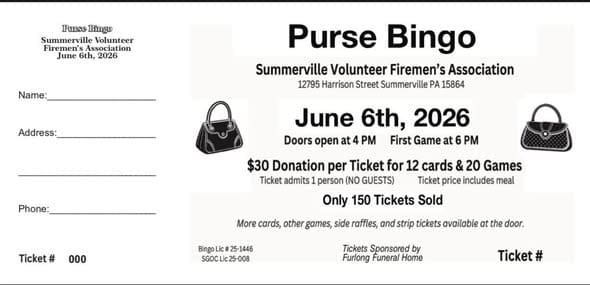 Please join us for our Purse bingo event. There will be cash prizes and designer purses. Tickets are $30 each admits one. Ticket purchase gets you 12 bingo cards for 20 games and a light meal. There will be other games sold separately as well as more cards available. Rip tickets, 50/50, chinese auction all available at event as well. Only 200 tickets sold so get yours while you can! Tickets can be purchased at any event we host, through members in person, or through our square siteĀ https://summerville-volunteer-firemens-association.square…