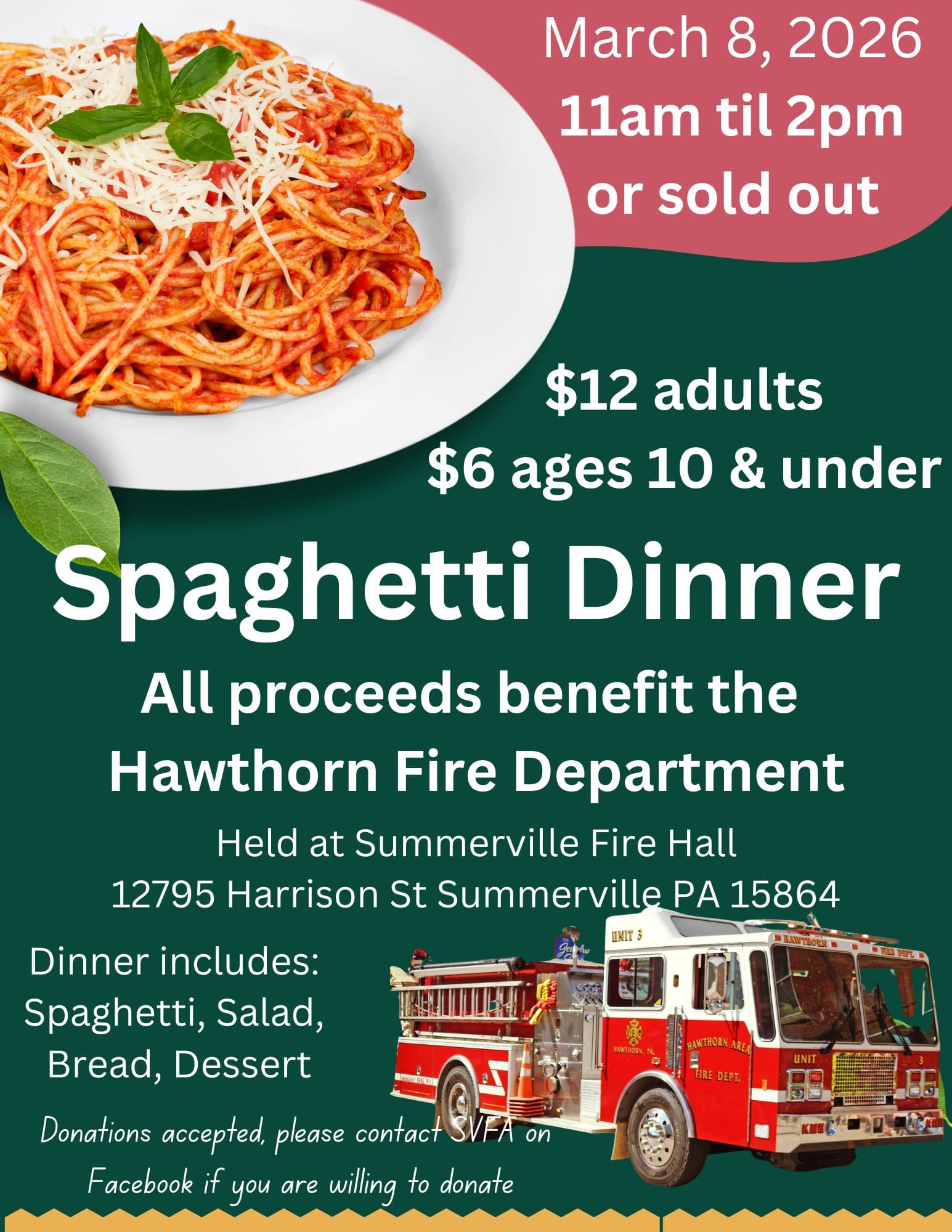 Because of this the members of Summerville Volunteer Firemen’s Association have decided to host a benefit Spaghetti dinner on Sunday March 8th from 11am til 2pm or sold out to help our neighbors. Hawthorn VFD will receive all proceeds from the dinner.