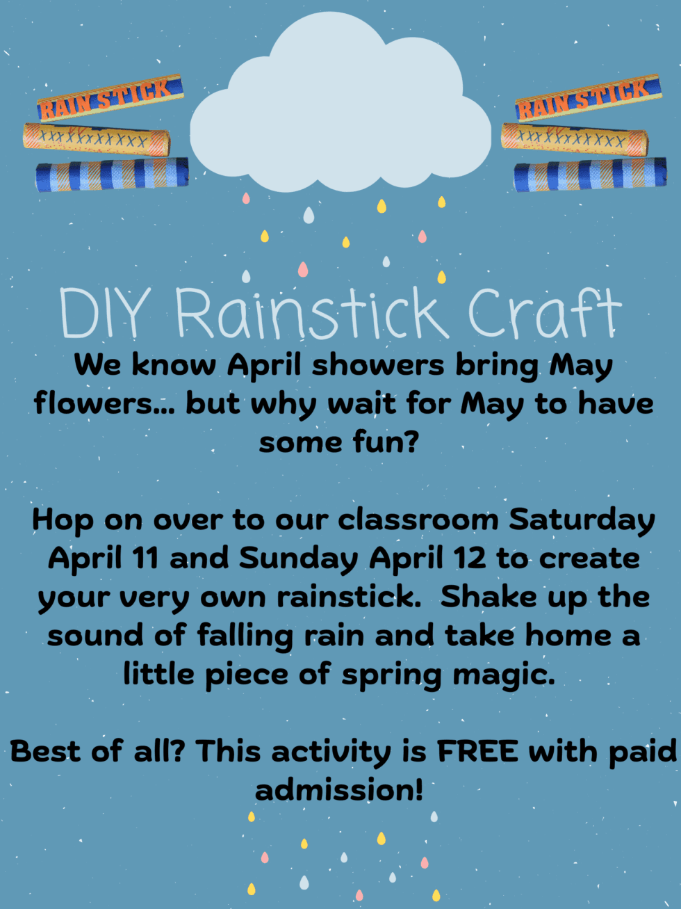 We know that April showers bring May flowers…but why wait for May to have some fun? Hop into our classroom on Saturday, April 11 and Sunday, April 12 and create your very own rain stick! Shake up the sound of falling rain an take home a little piece of spring magic. Best of all? This hands=on activity is FREE with paid admission! Don’t miss out on the fun- we can’t wait to see you there!