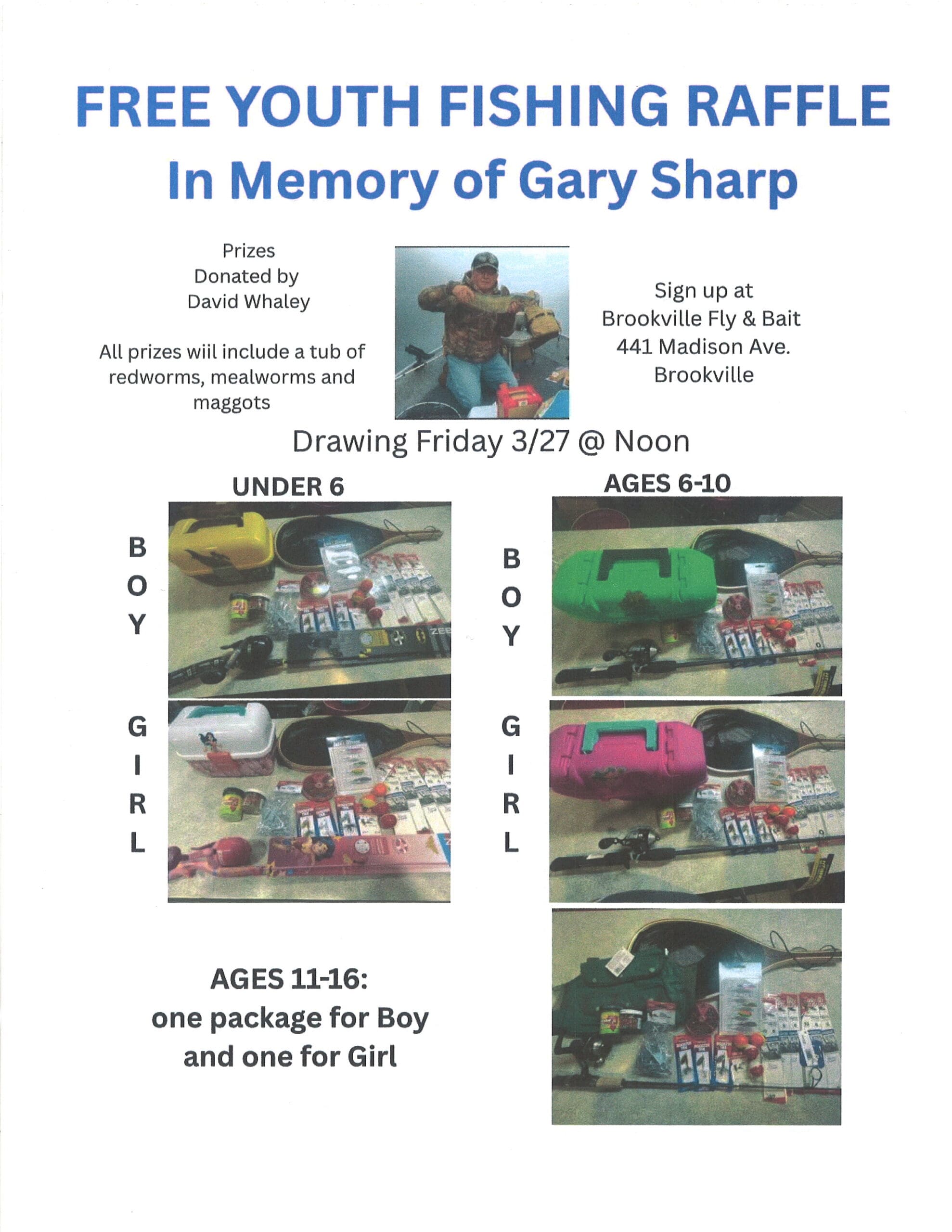 Celebrate the love of the outdoors and honor the memory of Gary Sharp with a Free Youth Fishing Raffle! We want to get the next generation hooked on fishing, so we’re giving away six incredible prize packages to local youth. The Prizes: We are giving away one prize package for a boy and one for a girl in each of the following age groups: Under 6 years old Ages 6–10 Ages 11–16 How to Enter: Entry is completely free! Stop by and sign up in person at: Brookville Fly & Bait 441 Madison Ave., Brookville, PA Drawing Date: Winners will be drawn on Friday, March 27th at noon. You don't want to miss out on these gear sets!