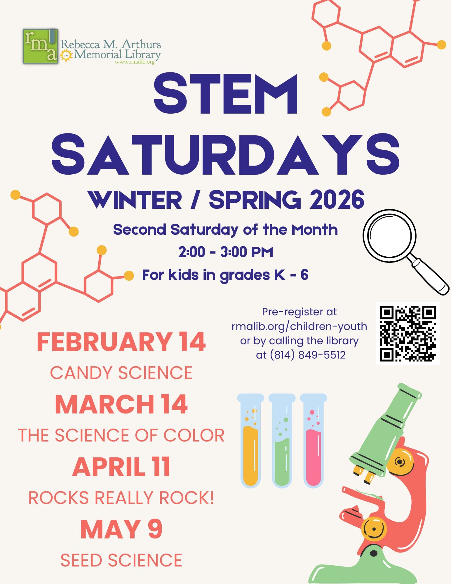 Stem Saturdays Second Saturdays Of The Month                                                                                                                           2:00pm till 3:00pm For Kids Grade K-6                                                                                                                             Marchn 14th will be The Science of Color