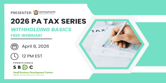 Date: 4/8/2026 Time: 12:00 PM - 1:00 PM (EDT) Status: Open - 420 places remaining Registration Deadline: 4/8/2026 12:00 PM (EDT) Fee: No Fee Point of Contact: Cindy Nellis (814) 393-2060 Program Format: Online Meeting (Live) Training Topics: Accounting/Budget, Business Start-up/Preplanning, Managing a Business, Other, Tax Planning Description: Whether you’re ready to hire your first employee, you already have employees, or you are looking to pay someone to perform services for your business, this module will help you navigate withholding basics from W2 income to 1099s. You will learn when you need to withhold from compensation, which income statements apply to different types of employees or contractors, how to file and pay withholding, as well as year-end reporting. Additionally, this module will touch on withholding for retirement income and PA rules for different types of retirement withdraws. Instructions:Once you register for this event, you will receive an email with a Zoom link. Using that link, you will register with Zoom to receive the link to log into the webinar. Tax Series 2026 - Final Flyer.pdf (2 MB) Registration Policies: Registration and Fees: Payment of seminar fees may be made by check, money order or credit card. We ask that the seminar fee be paid prior to the event to guarantee your space. You may send a check payable to 'PennWest University' to the following address: Attention: PennWest University - Clarion SBDC Training Coordinator PennWest University 896 E. Main Street Clarion PA 16214-3873 Cancellation/Refund Policy: Cancellation/Refund Policy: If you are registered for a class or webinar and are unable to attend, please notify the Small Business Development Center, before the event, at (814) 393-2060 as other applicants may be waiting for the course. Substitutions can be made at any time. The following cancellation/rescheduling policy apply to all face to face classes unless noted otherwise: * Five (5) or more business days notice: Full Refund or may reschedule for a class that is within the calendar year. Less than five (5) days notice, no refund. Special Accommodations: In accordance with the American Disabilities Act and state law, you may request accommodations due to a disability by contacting the event organizer listed above. Advance notice may be necessary for some accommodations. Registration must be paid prior to accommodation requests. Acknowledgments Pennsylvania Small Business Development Centers are funded in part through a cooperative agreement with the U.S. Small Business Administration, by the Commonwealth of Pennsylvania through the Department of Community & Economic Development, through support from Service Center host institutions, and by other sources of state and federal funding. All opinions, conclusions, and/or recommendations expressed herein are those of the author(s) and do not necessarily reflect the views of the SBA. This training event is supported by federal taxpayer funds. By registering, I recognize that services are provided in a nondiscriminatory way to all legal residents and citizens in the U.S. and I understand that Small Business Development Centers are prohibited from providing services funded by taxpayer dollars to individuals not lawfully present in the United States.